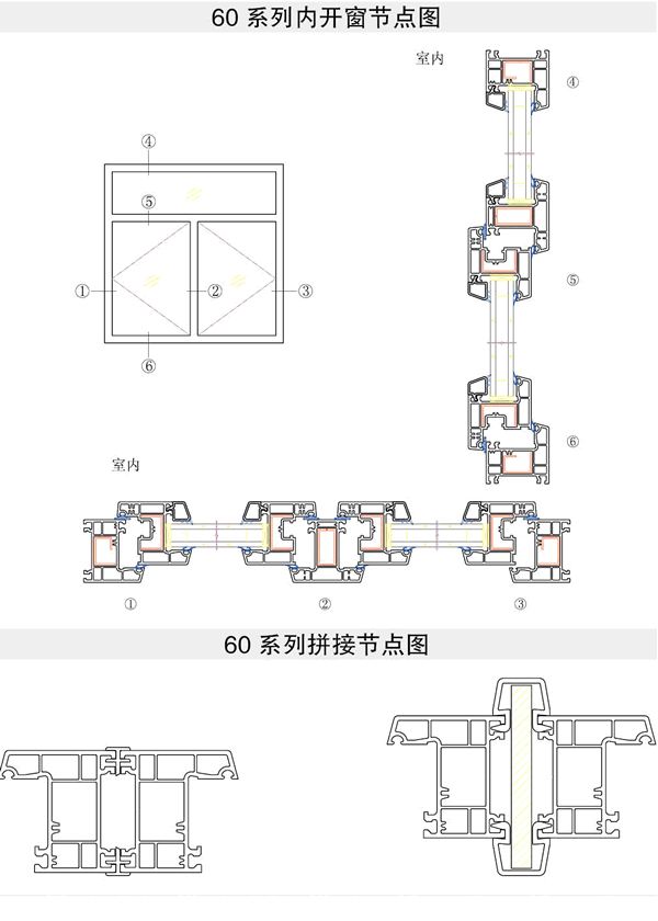 1、60系列主型材采用三腔結(jié)構(gòu),設(shè)有獨立排水腔、增強型鋼腔、保溫隔音腔,使熱傳導(dǎo)K值在2.0以下。